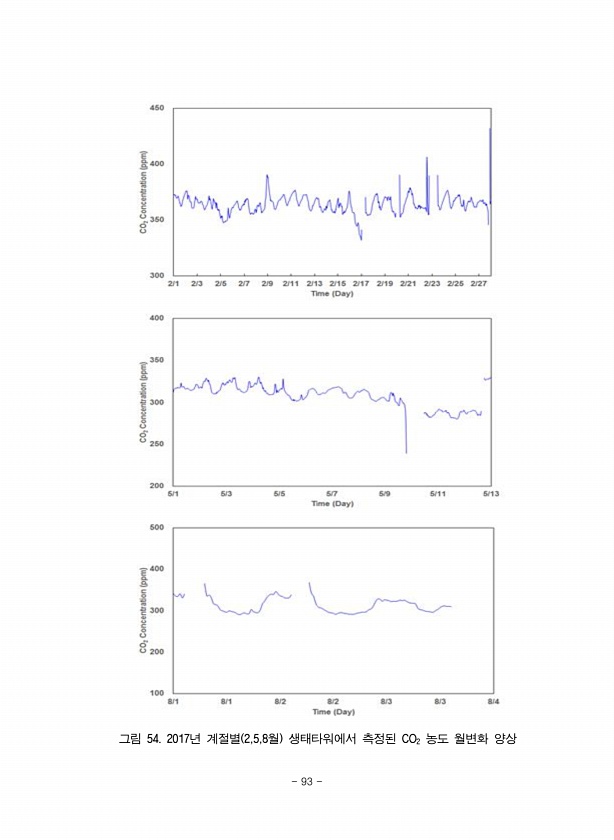 그림 54. 2017년 계절별 2,5,8월 생태타워에서 측정된 CO2 농도 월변화 양상 93