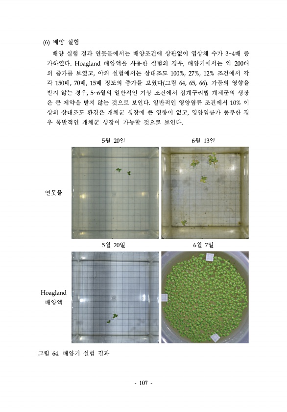 107 6 배양 실험 배양 실험 결과 연못물에서는 배양조건에 상관없이 엽상체 수가 34배 증 가하였다. Hoagland 배양액을 사용한 실험의 경우, 배양기에서는 약 200배 의 증가를 보였고, 야외 실험에서는 상대조도 100%, 27%, 12% 조건에서 각 각 150배, 70배, 15배 정도의 증가를 보였다 그림 64, 65, 66 가뭄의 영향을 받지 않는 경우, 56월의 일반적인 기상 조건에서 점개구리밥 개체군의 생장 은 큰 제약을 받지 않는 것으로 보인다. 일반적인 영양염류 조건에서 10% 이 상의 상대조도 환경은 개체군 생장에 큰 영향이 없고, 영양염류가 풍부한 경 우 폭발적인 개체군 생장이 가능할 것으로 보인다. 5월 20일 6월 13일 연못물 5월 20일 6월 7일 Hoagland 배양액 그림 6...