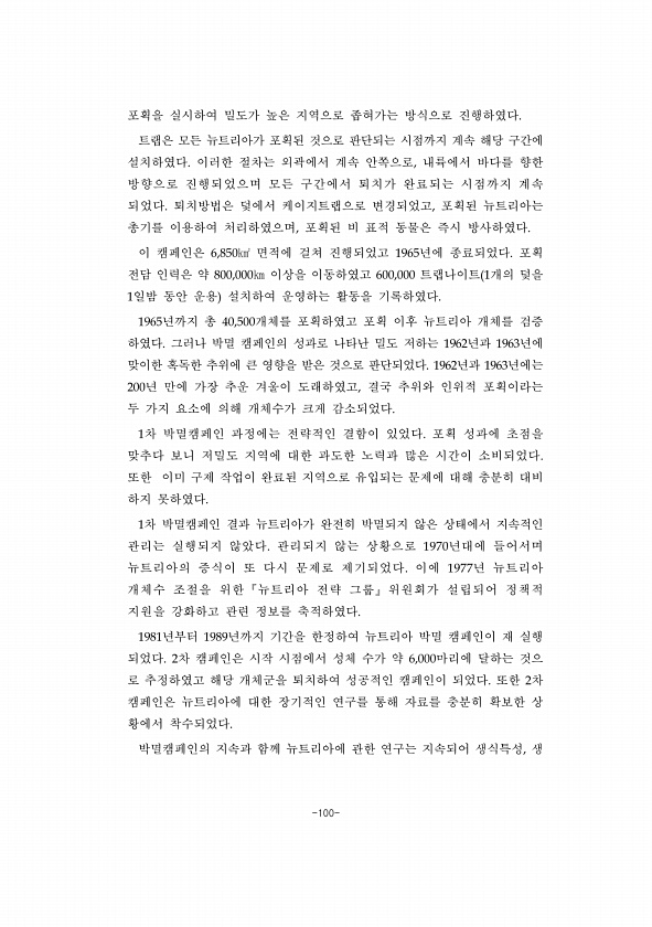 -100- 포획을 실시하여 밀도가 높은 지역으로 좁혀가는 방식으로 진행하였다. 트랩은 모든 뉴트리아가 포획된 것으로 판단되는 시점까지 계속 해당 구간에 설치하였다. 이러한 절차는 외곽에서 계속 안쪽으로, 내륙에서 바다를 향한 방향으로 진행되었으며 모든 구간에서 퇴치가 완료되는 시점까지 계속 되었다. 퇴치방법은 덫에서 케이지트랩으로 변경되었고, 포획된 뉴트리아는 총기를 이용하여 처리하였으며, 포획된 비 표적 동물은 즉시 방사하였다. 이 캠페인은 6,850㎢ 면적에 걸쳐 진행되었고 1965년에 종료되었다. 포획 전담 인력은 약 800,000㎞ 이상을 이동하였고 600,000 트랩나이트 1개의 덫을 1일밤 동안 운용 설치하여 운영하는 활동을 기록하였다. 1965년까지 총 40,500개체를 포획하였고 포획 이후 뉴...