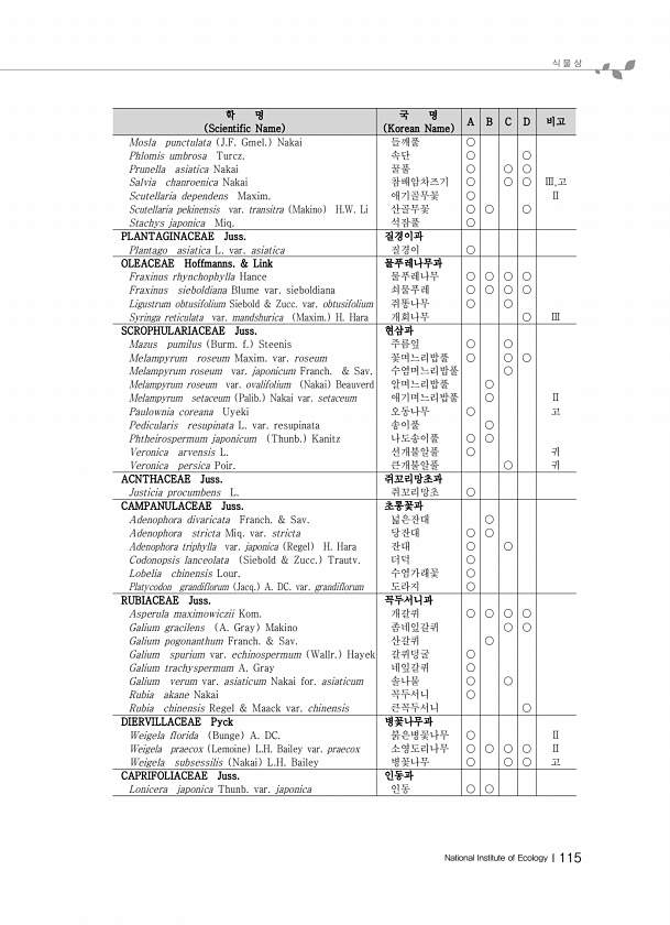 식 물 상 National Institute of EcologyⅠ115 학 명 Scientific Name 국 명 Korean Name A B C D 비고 Mosla punctulata J.F. Gmel. Nakai 들깨풀 ○ Phlomis umbrosa Turcz. 속단 ○ ○ Prunella asiatica Nakai 꿀풀 ○ ○ ○ Salvia chanroenica Nakai 참배암차즈기 ○ ○ ○ Ⅲ,고 Scutellaria dependens Maxim. 애기골무꽃 ○ Ⅱ Scutellaria pekinensis var. transitra Makino H.W. Li 산골무꽃 ○ ○ ○ Stachys japonica Miq. 석잠풀 ○ PLANTAGINACEAE Juss. 질경이과 Plantago as...
