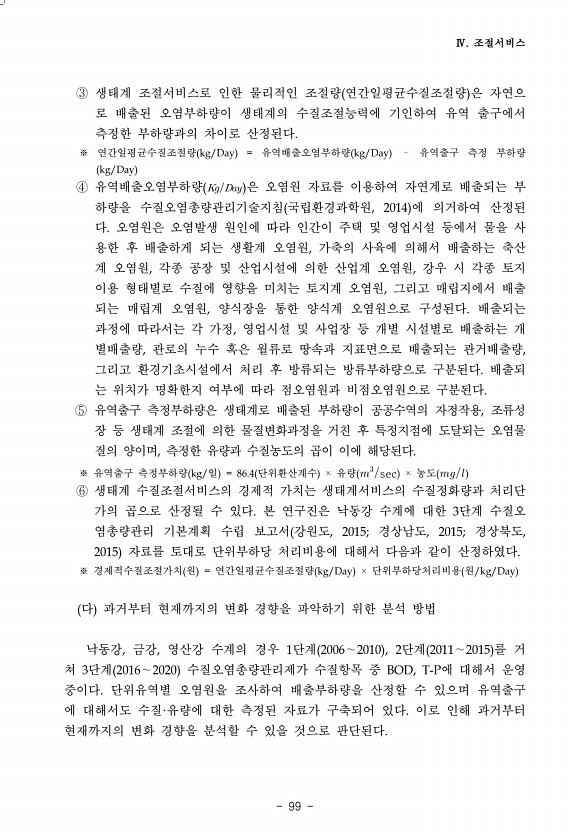 Ⅳ. 조절서비스 99 ③ 생태계 조절서비스로 인한 물리적인 조절량 연간일평균수질조절량 은 자연으 로 배출된 오염부하량이 생태계의 수질조절능력에 기인하여 유역 출구에서 측정한 부하량과의 차이로 산정된다. ※ 연간일평균수질조절량 kg/Day = 유역배출오염부하량 kg/Day ? 유역출구 측정 부하량 kg/Day ④ 유역배출오염부하량 ??? 은 오염원 자료를 이용하여 자연계로 배출되는 부 하량을 수질오염총량관리기술지침 국립환경과학원, 2014 에 의거하여 산정된 다. 오염원은 오염발생 원인에 따라 인간이 주택 및 영업시설 등에서 물을 사 용한 후 배출하게 되는 생활계 오염원, 가축의 사육에 의해서 배출하는 축산 계 오염원, 각종 공장 및 산업시설에 의한 산업계 오염원, 강우 시 각종 토지 이용 형태별로 수질...