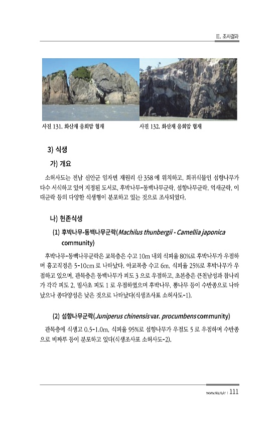 II. 조사결과 www.nie.re.kr ?111 3 소허사도는 전남 신안군 임자면 재원리 산 358 에 위치하고, 희귀식물인 섬향나무가 다수 서식하고 있어 지정된 도서로, 후박나무-동백나무군락, 섬향나무군락, 억새군락, 이 대군락 등의 다양한 식생형이 분포하고 있는 것으로 조사되었다. 1 Machilus thunbergii Camellia japonica community 후박나무-동백나무군락은 교목층은 수고 10m 내외 식피율 80%로 후박나무가 우점하 며 흉고직경은 5-10cm 로 나타났다. 아교목층 수고 6m, 식피율 25%로 후박나무가 우 점하고 있으며, 관목층은 동백나무가 피도 3 으로 우점하고, 초본층은 큰천남성과 참나리 가 각각 피도 2, 밀사초 피도 1 로 우점하였으며 후박나무, 뽕나무 등이...