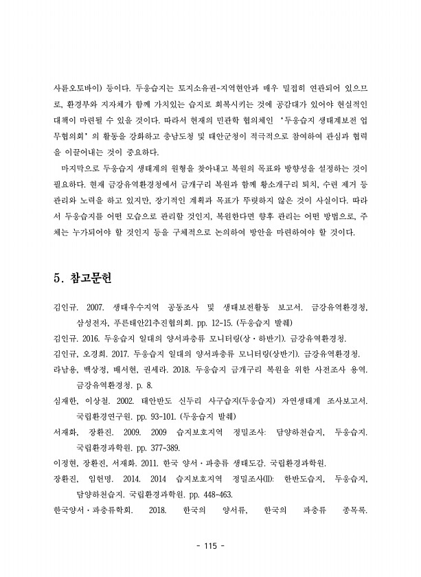 115 사륜오토바이 등이다. 두웅습지는 토지소유권-지역현안과 매우 밀접히 연관되어 있으므 로, 환경부와 지자체가 함께 가치있는 습지로 회복시키는 것에 공감대가 있어야 현실적인 대책이 마련될 수 있을 것이다. 따라서 현재의 민관학 협의체인 ‘두웅습지 생태계보전 업 무협의회’의 활동을 강화하고 충남도청 및 태안군청이 적극적으로 참여하여 관심과 협력 을 이끌어내는 것이 중요하다. 마지막으로 두웅습지 생태계의 원형을 찾아내고 복원의 목표와 방향성을 설정하는 것이 필요하다. 현재 금강유역환경청에서 금개구리 복원과 함께 황소개구리 퇴치, 수련 제거 등 관리와 노력을 하고 있지만, 장기적인 계획과 목표가 뚜렷하지 않은 것이 사실이다. 따라 서 두웅습지를 어떤 모습으로 관리할 것인지, 복원한다면 향후 관리는 어떤 방법으로...