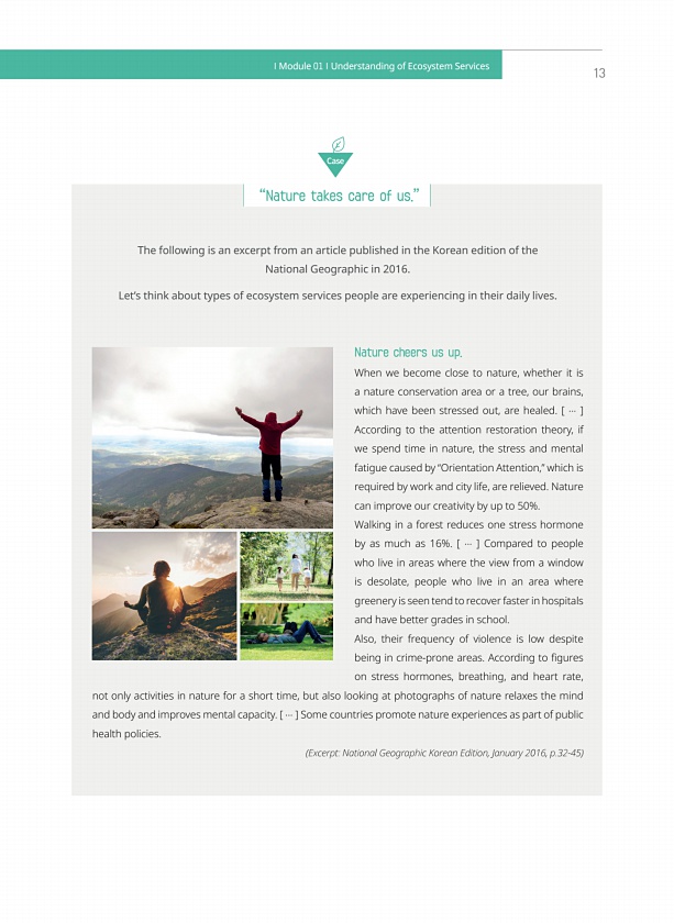 72 곤충 26종 뚱보주름메뚜기 Ⅱ급 멋조롱박딱정벌레 Ⅱ급 물방개 Ⅱ급 생물정보 바로가기 생물정보 바로가기 생물정보바로가기 of us.” Case The following is an excerpt from an article published in the Korean edition of the National Geographic in 2016. Let’s think about types of ecosystem services people are experiencing in their daily lives. Nature cheers us up. When we become close to nature, whether it is a nature conservation area or a tree, our brain...