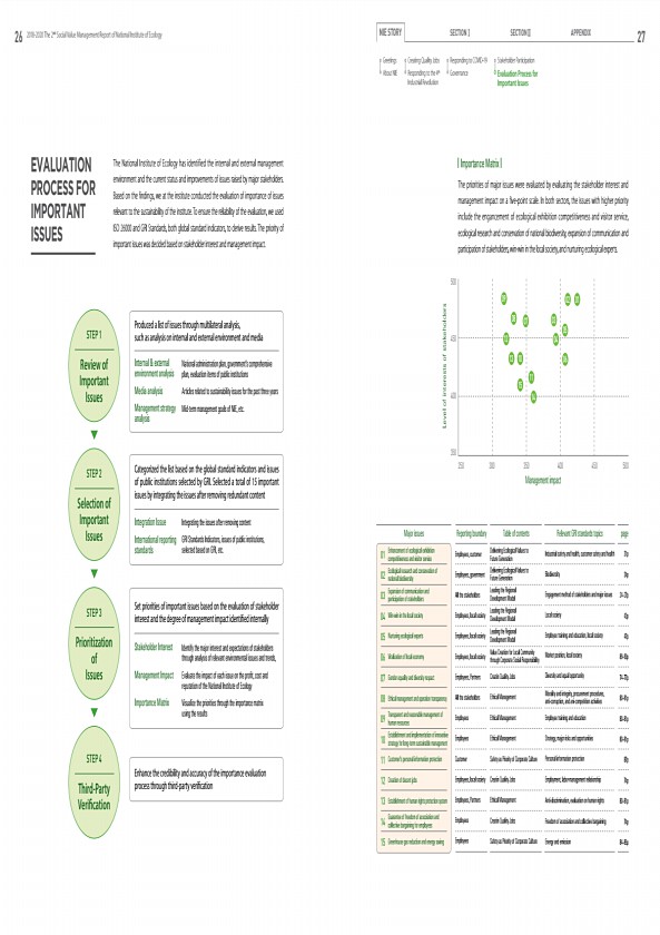 26 2018-2020 The 2nd Social Value Management Report of National Institute of Ecology NIE STORY SECTIONⅠ SECTIONⅡ APPENDIX 27 |Importance Matrix| Level of interests of stakeholders Enhancement of ecological exhibition competitiveness and visitor service Ecological research and conservation of national biodiversity Expansion of communication and participation of stakeholders Win-win in the local soc...