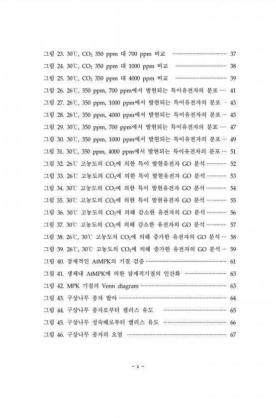 x 그림 23. 30℃, CO2 350 ppm 대 700 ppm 비교 ······································ 37 그림 24. 30℃, CO2 350 ppm 대 1000 ppm 비교 ···································· 38 그림 25. 30℃, CO2 350 ppm 대 4000 ppm 비교 ···································· 39 그림 26. 26℃, 350 ppm, 700 ppm에서 발현되는 특이유전자의 분포 ···· 41 그림 27. 26℃, 350 ppm, 1000 ppm에서 발현되는 특이유전자의 분포 · 43 그림 28. 26℃, 350 ppm, 4000 ppm에서 발현되는 특이유전자의 분포 ··· 45 그림 ...
