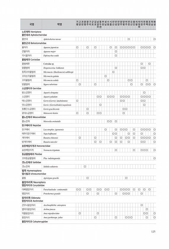 125 노린재목 Hemiptera 물빈대과 Aphelocheiridae 물빈대 Aphelocheirus nawae ○ ○ 물장군과 Belostomatidae 물자라 Appasus japonicus ○ ○ ○ ○ ○ ○○○○○○ ○○○○ ○ 큰물자라 Appasus major ○ 각시물자라 Diplonychus esakii ○ 물벌레과 Corixidae 물벌레류 Corixidae sp. ○ ○ 왕물벌레 Hesperocorixa hokkensis ○ ○○ 동쪽꼬마물벌레 Micronecta Basilionecta sahlbergii ○ 꼬마손자물벌레 Micronecta guttata ○ 꼬마물벌레 Micronecta sedula ○ ○ ○○ ○ 방물벌레 Sigara substriata ○ ○ ○ ○ ○○ ○ 소금쟁...