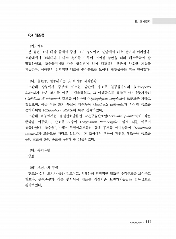 Ⅱ. 조사결과 www.nie.re.kr ? 117 6 해조류 가 개요 본 섬은 조사 대상 중에서 중간 크기 정도이고, 연안에서 다소 떨어져 위치한다. 조간대에서 조하대까지 다소 경사를 이루며 이어진 암반을 따라 해조군락이 잘 발달하였고, 조수웅덩이도 다수 형성되어 있어 해조류의 생육에 양호한 기질을 제공한다. 서해안의 전형적인 해조류 수직분포를 보이나, 출현종수는 적은 편이었다. 나 출현종, 멸종위기종 및 희귀종 서식현황 조간대 상부에서 중부에 이르는 암반에 홍조류 불등풀가사리 Gloiopeltis furcata 가 작은 뙈기를 이루며 생육하였고, 그 아래쪽으로 홍조류 애기우뭇가사리 Gelidium divaricatum , 갈조류 바위수염 Myelophycus simplex 이 드문드문 자라고 있었으며, 이...