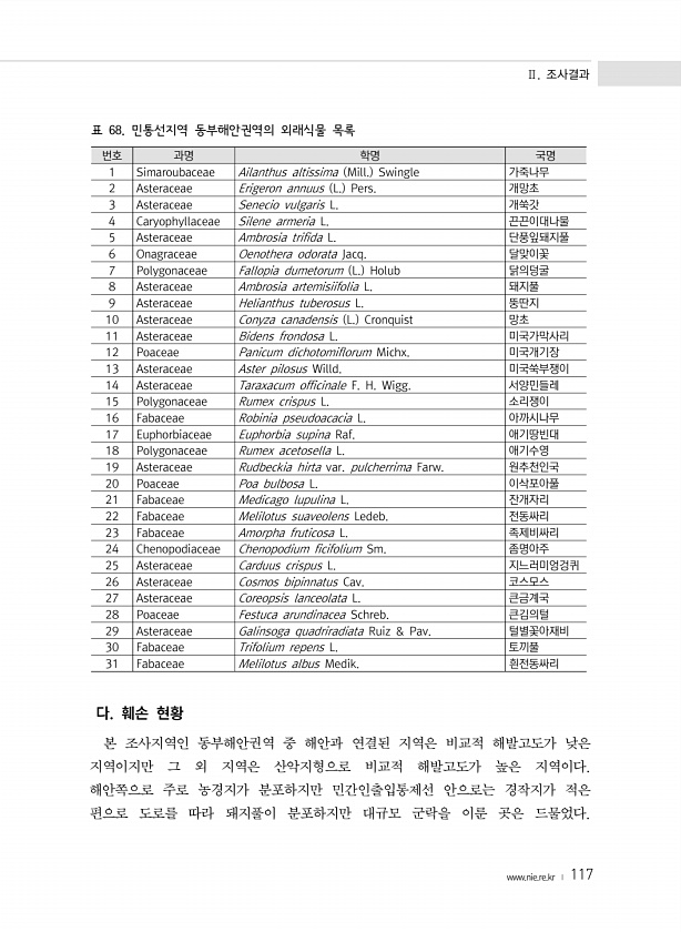 Ⅱ. 조사결과 www.nie.re.kr ? 117 번호 과명 학명 국명 1 Simaroubaceae Ailanthus altissima Mill. Swingle 가죽나무 2 Asteraceae Erigeron annuus L. Pers. 개망초 3 Asteraceae Senecio vulgaris L. 개쑥갓 4 Caryophyllaceae Silene armeria L. 끈끈이대나물 5 Asteraceae Ambrosia trifida L. 단풍잎돼지풀 6 Onagraceae Oenothera odorata Jacq. 달맞이꽃 7 Polygonaceae Fallopia dumetorum L. Holub 닭의덩굴 8 Asteraceae Ambrosia artemisiifolia L. 돼지풀 9 Asterac...