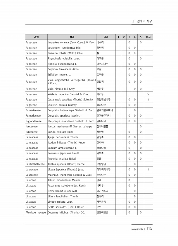 Ⅱ. 관매도 사구 www.nie.re.kr ? 115 과명 학명 국명 1 2 3 4 5 비고 Fabaceae Lespedeza cuneata Dum. Cours. G. Don. 비수리 0 0 Fabaceae Lespedeza cyrtobotrya Miq. 참싸리 0 0 Fabaceae Pueraria lobata Willd. Ohwi 칡 0 0 Fabaceae Rhynchosia volubilis Lour. 여우콩 0 0 Fabaceae Robinia pseudoacacia L. 아까시나무 0 0 Fabaceae Sophora flavescens Aiton 고삼 0 0 0 Fabaceae Trifolium repens L. 토끼풀 0 0 0 Fabaceae Vicia angustifolia var.seget...