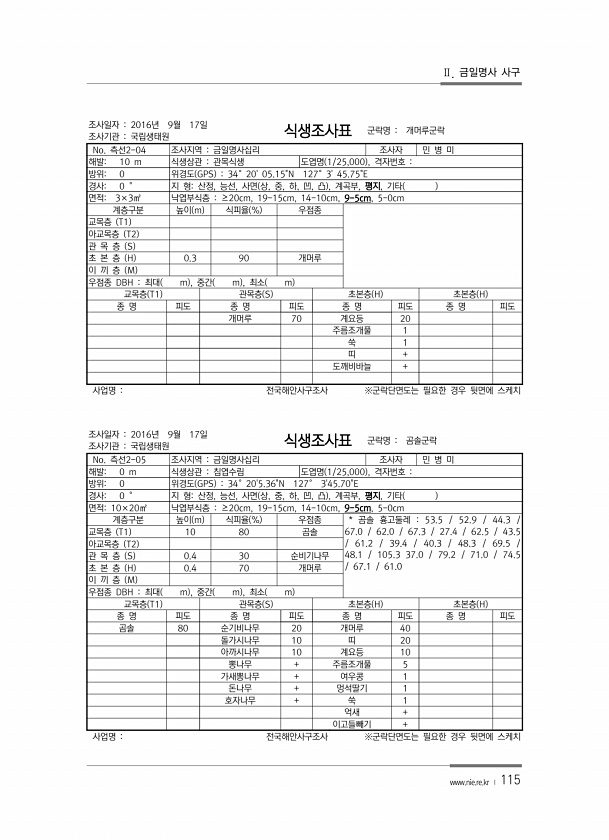 Ⅱ. 금일명사 사구 www.nie.re.kr ? 115 조사일자 2016년 9월 17일 조사기관 국립생태원 식생조사표 군락명 개머루군락 No. 측선2-04 조사지역 금일명사십리 조사자 민 병 미 해발10 m 식생상관 관목식생 도엽명 1/25,000 , 격자번호 방위0 위경도 GPS 34°2005.15N 127°345.75E 경사0 ° 지 형산정, 능선, 사면 상, 중, 하, 凹, 凸 , 계곡부, 평지, 기타 면적3×3㎡ 낙엽부식층 ≥20cm, 19-15cm, 14-10cm, 9-5cm, 5-0cm 계층구분 높이 m 식피율 % 우점종 교목층 T1 아교목층 T2 관 목 층 S 초 본 층 H 0.3 90 개머루 이 끼 층 M 우점종 DBH 최대 m , 중간 m , 최소 m 교목층 T1 관목층 S 초본층 H 초본층...