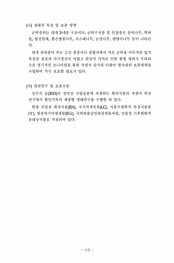 113 나 생태적 특성 및 보존 방향 군락층위는 대개 층 구조이다 군락구성종 및 인접종은 분비나무 떡버 들 털진달래 붉은병꽃나무 사스래나무 눈잣나무 댕댕이나무 등이 나타난 다 대개 찬바람이 부는 고산 풍충지나 풍혈지에서 작은 군락을 이루지만 입지 특성상 결실과 자기갱신이 어렵고 관상적 가치로 인한 불법 채취가 우려되 므로 정기적인 모니터링을 통한 자생지 감시와 더불어 현지내외 보존대책을 수립하여 적극 보호할 필요가 있다 다 관련연구 및 보호수준 심주석 등 은 설악산 국립공원에 자생하는 희귀식물의 자생지 특성 연구에서 흰인가목의 계절별 생태연구를 수행한 바 있다 현재 산림청 희귀식물 국가적색목록 식물구계학적 특정식물종 멸종위기야생생물 급 국외반출승인대상생물자원 산림청 기후변화적 응대상식물로 지정되어있다
