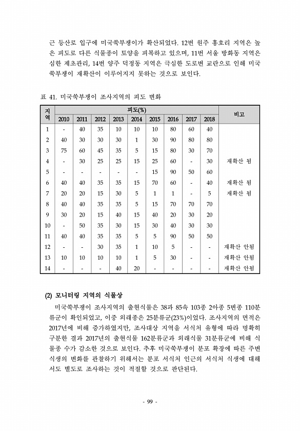 99 근 등산로 입구에 미국쑥부쟁이가 확산되었다. 12번 원주 흥호리 지역은 높 은 피도로 다른 식물종이 토양을 피복하고 있으며, 11번 서울 방화동 지역은 심한 제초관리, 14번 양주 덕정동 지역은 극심한 도로변 교란으로 인해 미국 쑥부쟁이 재확산이 이루어지지 못하는 것으로 보인다. 지역 피도 % 비고 2010 2011 2012 2013 2014 2015 2016 2017 2018 1 40 35 10 10 10 80 60 40 2 40 30 30 30 1 30 90 80 80 3 75 60 45 35 5 15 80 30 70 4 30 25 25 15 25 60 30 재확산 됨 5 15 90 50 60 6 40 40 35 35 15 70 60 40 재확산 됨 7 20 20 15 30 5 1 1 5 재확산 됨...
