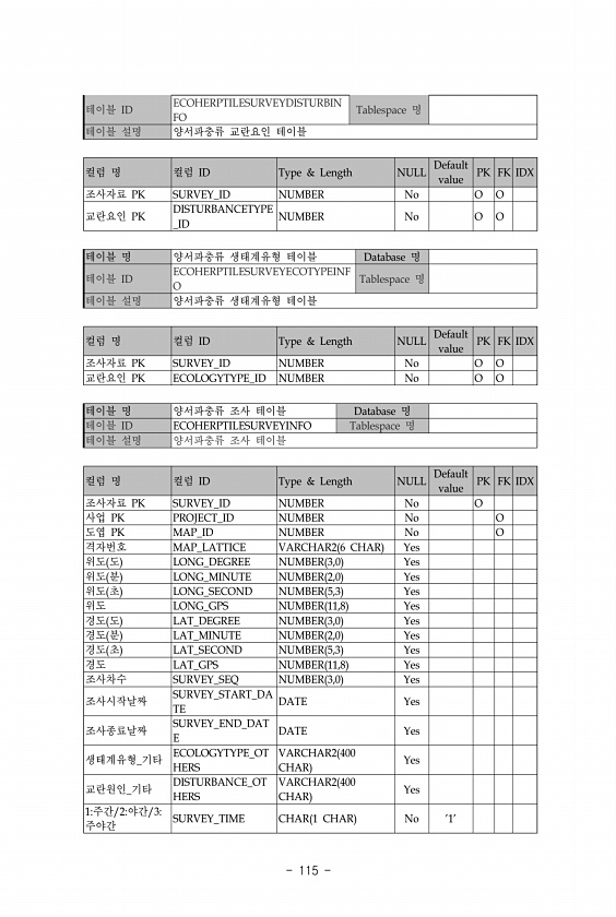 115 테이블 ID ECOHERPTILESURVEYDISTURBIN FO Tablespace 명 테이블 설명 양서파충류 교란요인 테이블 컬럼 명 컬럼 ID Type & Length NULL Default value PK FK IDX 조사자료 PK SURVEY_ID NUMBER No O O 교란요인 PK DISTURBANCETYPE _ID NUMBER No O O 테이블 명 양서파충류 생태계유형 테이블 Database 명 테이블 ID ECOHERPTILESURVEYECOTYPEINF O Tablespace 명 테이블 설명 양서파충류 생태계유형 테이블 컬럼 명 컬럼 ID Type & Length NULL Default value PK FK IDX 조사자료 PK SURVEY_ID NUMBER No O O 교란요인...