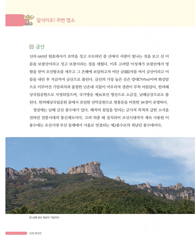 남해 앵강만 금산 신라 683년 원효대사가 초막을 짓고 수도하던 중 산에서 서광이 빛나는 것을 보고 산 이 름을 보광산이라고 짓고 보광사라는 절을 세웠다. 이후 고려말 이성계가 보광산에서 영 험을 얻어 조선왕조를 세우고 그 은혜에 보답하고자 비단 금 錦 자를 써서 금산이라고 이 름을 내린 후 지금까지 금산으로 불린다. 금산의 가장 높은 곳은 망대 705m 이며 화강암 으로 이루어진 기암괴석과 울창한 난온대 식물이 어우러져 경관이 무척 아름답다. 한려해 상국립공원으로 지정되었으며, 국가명승 제36호인 명산으로 소금강, 남해금강으로도 불 린다. 한려해상국립공원 중에서 유일한 산악공원으로 쌍홍문을 비롯한 38경이 유명하다. 정상에는 남해 금산 봉수대가 있다. 왜적의 침입을 알리는 군사적 목적과 급한 소식을 전하던...