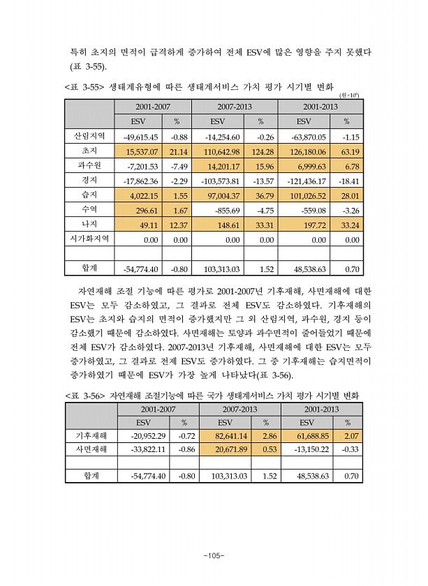 -105- 특히 초지의 면적이 급격하게 증가하여 전체 에 많은 영향을 주지 못했다 표 원 산림지역 초지 과수원 경지 습지 수역 나지 시가화지역 합계 표 생태계유형에 따른 생태계서비스 가치 평가 시기별 변화 자연재해 조절 기능에 따른 평가로 년 기후재해 사면재해에 대한 는 모두 감소하였고 그 결과로 전체 도 감소하였다 기후재해의 는 초지와 습지의 면적이 증가했지만 그 외 산림지역 과수원 경지 등이 감소했기 때문에 감소하였다 사면재해는 토양과 과수면적이 줄어들었기 때문에 전체 가 감소하였다 년 기후재해 사면재해에 대한 는 모두 증가하였고 그 결과로 전제 도 증가하였다 그 중 기후재해는 습지면적이 증가하였기 때문에 가 가장 높게 나타났다 표 기후재해 사면재해 합계 표 자연재해 조절기능에 따른 국가 생태계서비스 가...