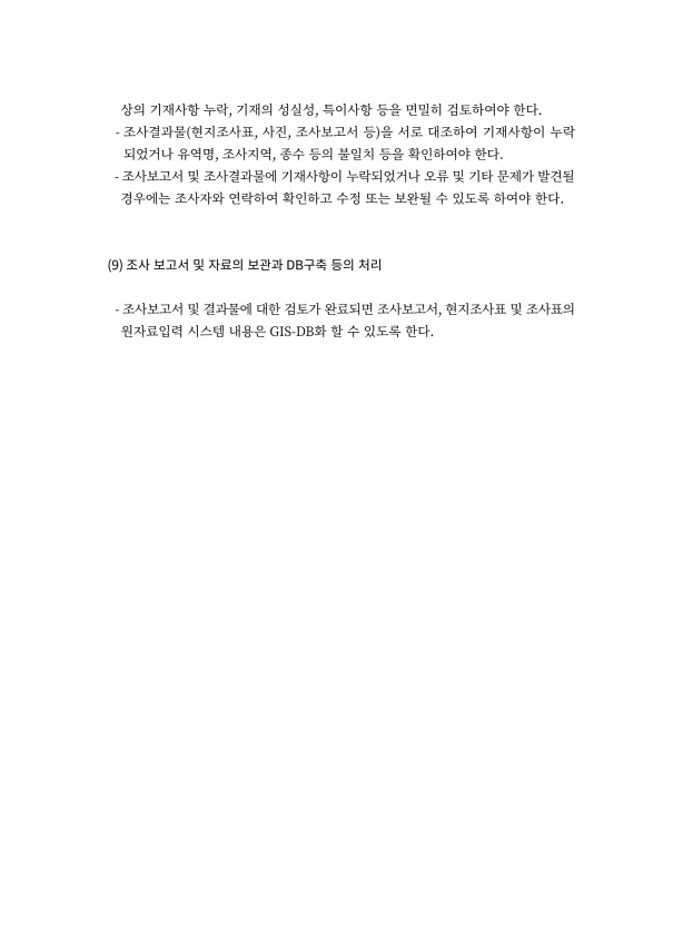 상의?기재사항?누락, 기재의?성실성, 특이사항?등을?면밀히?검토하여야?한다. 조사결과물 현지조사표, 사진, 조사보고서?등 을?서로?대조하여?기재사항이?누락 되었거나?유역명, 조사지역, 종수?등의?불일치?등을?확인하여야?한다. 조사보고서?및?조사결과물에?기재사항이?누락되었거나?오류?및?기타?문제가?발견될 경우에는?조사자와?연락하여?확인하고?수정?또는?보완될?수?있도록?하여야?한다. 9 조사?보고서?및?자료의?보관과 DB구축?등의?처리 조사보고서?및?결과물에?대한?검토가?완료되면?조사보고서, 현지조사표?및?조사표의 원자료입력?시스템?내용은GIS-DB화?할?수?있도록?한다.
