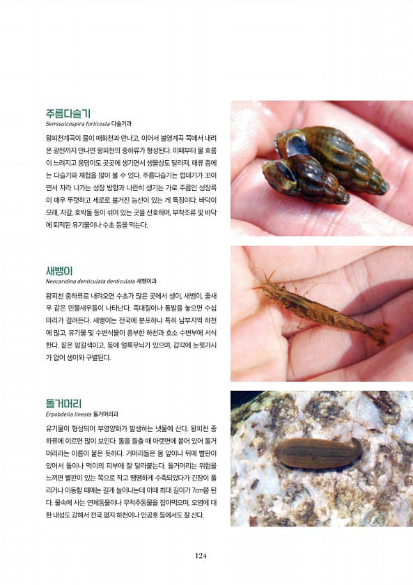 124 돌거머리 Erpobdella lineata 돌거머리과 유기물이 형성되어 부영양화가 발생하는 냇물에 산다. 왕피천 중 하류에 이르면 많이 보인다. 돌을 들출 때 아랫면에 붙어 있어 돌거 머리라는 이름이 붙은 듯하다. 거머리들은 몸 앞이나 뒤에 빨판이 있어서 돌이나 먹이의 피부에 잘 달라붙는다. 돌거머리는 위험을 느끼면 빨판이 있는 쪽으로 작고 땡땡하게 수축되었다가 긴장이 풀 리거나 이동할 때에는 길게 늘어나는데 이때 최대 길이가 7cm쯤 된 다. 물속에 사는 연체동물이나 무척추동물을 잡아먹으며, 오염에 대 한 내성도 강해서 전국 평지 하천이나 인공호 등에서도 잘 산다. 새뱅이 Neocaridina denticulata denticulata 새뱅이과 왕피천 중하류로 내려오면 수초가 많은 곳에서 생이, 새...
