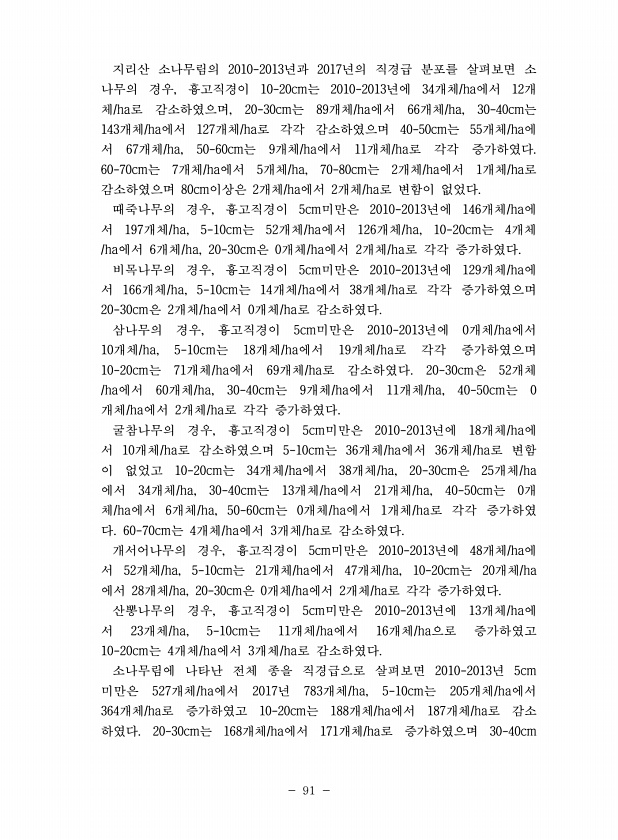 91 지리산 소나무림의 2010-2013년과 2017년의 직경급 분포를 살펴보면 소 나무의 경우, 흉고직경이 10-20cm는 2010-2013년에 34개체/ha에서 12개 체/ha로 감소하였으며, 20-30cm는 89개체/ha에서 66개체/ha, 30-40cm는 143개체/ha에서 127개체/ha로 각각 감소하였으며 40-50cm는 55개체/ha에 서 67개체/ha, 50-60cm는 9개체/ha에서 11개체/ha로 각각 증가하였다. 60-70cm는 7개체/ha에서 5개체/ha, 70-80cm는 2개체/ha에서 1개체/ha로 감소하였으며 80cm이상은 2개체/ha에서 2개체/ha로 변함이 없었다. 때죽나무의 경우, 흉고직경이 5cm미만은 2010-2013년에 146개체/ha에 서 197개체/ha, 5-10cm...