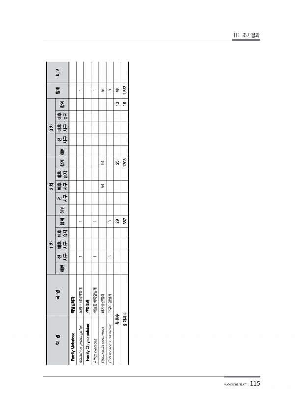 115 학 명 국 명 1 차 2 차 3 차 합계 비고 해빈 전 사구 배후 사구 배후 습지 합계 해빈 사구 전 배후 사구 배후 습지 합계 해빈 사구 전 배후 사구 배후 습지 합계 Family Melyridae 의병벌레과 Malachius prolongatus 노랑무늬의병벌레 1 1 1 Family Chrysomelidae 잎벌레과 Altica oleracea 바늘꽃벼룩잎벌레 1 1 1 Opheraella communa 돼지풀잎벌레 54 54 54 Colasposoma dauricum 고구마잎벌레 3 3 3 총 종수 29 25 13 49 총 개체수 357 1203 191,582