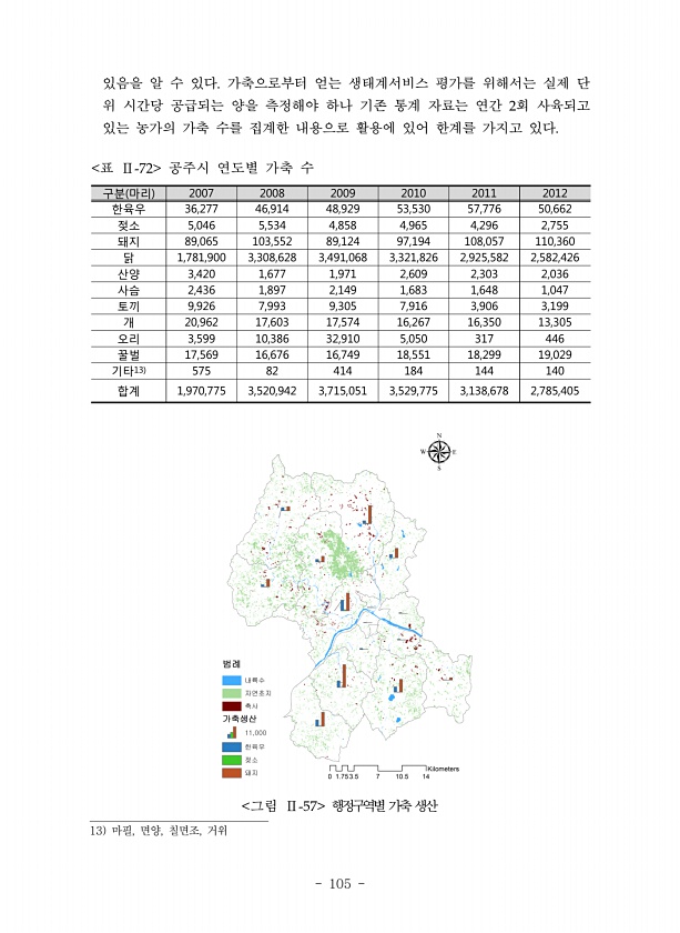 105 있음을 알 수 있다 가축으로부터 얻는 생태계서비스 평가를 위해서는 실제 단 위 시간당 공급되는 양을 측정해야 하나 기존 통계 자료는 연간 회 사육되고 있는 농가의 가축 수를 집계한 내용으로 활용에 있어 한계를 가지고 있다 구분 마리 2007 2008 2009 2010 2011 2012 한육우 36,277 46,914 48,929 53,530 57,776 50,662 젖소 5,046 5,534 4,858 4,965 4,296 2,755 돼지 89,065 103,552 89,124 97,194 108,057 110,360 닭 1,781,900 3,308,628 3,491,068 3,321,826 2,925,582 2,582,426 산양 3,420 1,677 1,971 2,609 2,303 2,036 사슴...