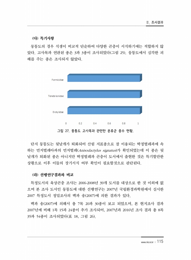 Ⅱ. 조사결과 www.nie.re.kr ? 115 다 특기사항 뭉퉁도의 경우 식생이 비교적 단순하여 다양한 곤충이 서식하기에는 적합하지 않 았다. 고사목과 연관된 종은 3과 3종이 조사되었다 그림 25 뭉퉁도에서 심각한 피 해를 주는 종은 조사되지 않았다. 그림 27. 뭉퉁도 고사목과 관련한 분류군 종수 현황. 단지 뭉퉁도는 뒷날개가 퇴화되어 산림 지표종으로 잘 이용되는 딱정벌레과에 속 하는 먼지벌레아과의 먼지벌레 Anisodactylus signatus 가 확인되었는데 이 종은 뒷 날개가 퇴화된 종은 아니지만 딱정벌레과 곤충이 도서에서 출현한 것은 특기할만한 상황으로 이후 이들의 장기서식 여부 확인이 필요할것으로 판단된다. 라 선행연구결과와 비교 특정도서의 육상곤충 조사는 2006-2008년 39개 도서를...