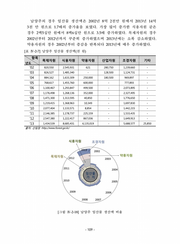남양주의 경우 임산물 생산액은 2002년 8억 2천만 원에서 2013년 14억 3천 만 원으로 1.7배의 증가율을 보였다. 가장 많이 증가한 식용자원 같은 경우 2백5십만 원에서 8백6십만 원으로 3.5배 증가하였다. 목재자원의 경우 2002년부터 2012년까지 꾸준히 증가하였으며 2013년에는 소폭 감소하였다. 약용자원의 경우 2002년부터 증감을 반복되다 2013년에 매우 증가하였다. 항목 년도 목재자원 식용자원 약용자원 산업자원 조경자원 기타 ‘02 820,550 2,545,931 621 280,750 1,239,660 ‘03 826,527 1,485,340 128,500 1,124,731 ‘04 884,162 1,633,309 250,000 180,500 969,897 ‘05 768,617 1,455...