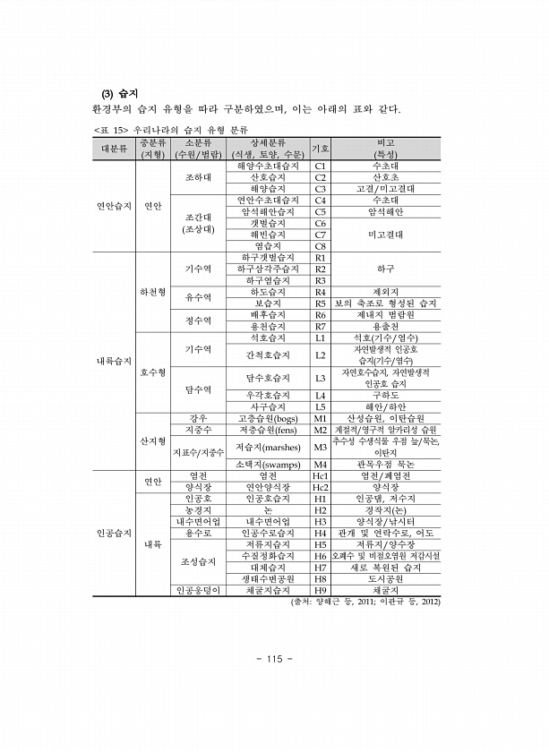 115 대분류 중분류 지형 소분류 수원 범람 상세분류 식생 토양 수문 기호 비고 특성 연안습지 연안 조하대 해양수초대습지 수초대 산호습지 산호초 해양습지 고결 미고결대 조간대 조상대 연안수초대습지 수초대 암석해안습지 암석해안 갯벌습지 해빈습지 미고결대 염습지 내륙습지 하천형 기수역 하구갯벌습지 하구삼각주습지 하구 하구염습지 유수역 하도습지 제외지 보습지 보의 축조로 형성된 습지 정수역 배후습지 제내지 범람원 용천습지 용출천 호수형 기수역 석호습지 석호 기수 염수 간척호습지 자연발생적 인공호 습지 기수 염수 담수역 담수호습지 자연호수습지 자연발생적 인공호 습지 우각호습지 구하도 사구습지 해안 하안 산지형 강우 고층습원 산성습원 이탄습원 지중수 저층습원 계절적 영구적 알카리성 습원 지표수 지중수 저습지 추수성 ...
