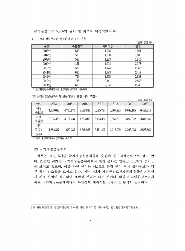 765 부족분은 2조 5,856억 원이 될 것으로 예측되었다.83 단위십억 원 구분 중앙정부 지방정부 합계 2006년 543 1,018 1,561 2007년 579 1,230 1,806 2008년 533 1,283 1,815 2009년 451 1,924 2,375 2010년 590 1,774 2,365 2011년 625 1,793 2,419 2012년 723 1,965 2,688 2013년 715 2,141 2,855 2014년 676 2,064 2,740 * 한국환경정책?평가연구원 환경전략실 2016 , 내부자료. 표 3-78 정부부문의 생물다양성 보호 지출 단위백만 원 연도 2014 2015 2016 2017 2018 2019 2020 재정 수요 a 4,719,638 4,795,970 5,528,939 ...