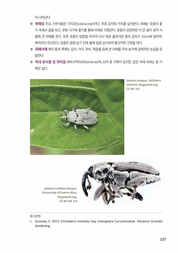 127 이 나타난다. ● 위해성 주요 기주식물은 가지과 Solanaceae 이다. 주로 감자와 가지를 섭식한다. 피해는 유충이 줄 기 속에서 굴을 파고, 부화 시기에 줄기를 통해 아래로 이동한다. 유충이 성장하면 더 큰 굴이 생겨 식 물에 큰 피해를 준다. 또한 유충이 방향을 바꾸어 다시 위로 올라가면 굴의 길이가 30cm에 달하며, 뿌리까지 파고든다. 성충은 알을 낳기 전에 봄에 잎을 섭식하여 불규칙한 구멍을 낸다. ● 피해사례 북미 동부 쪽에는 감자, 가지, 꽈리, 독말풀 등에 큰 피해를 주어 농가에 경제적인 손실을 유 발한다. ● 국내 유사종 및 차이점 애바구미아과 Baridivae 에 20여 종 기록이 있지만, 같은 속에 속하는 종 기 록은 없다. 참고문헌 1. Grovida, F. 2012 Tric...