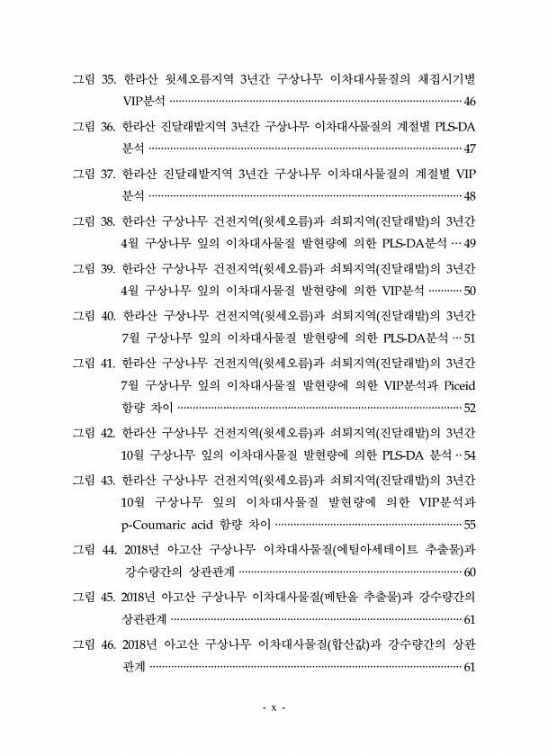 x 그림 35. 한라산 윗세오름지역 3년간 구상나무 이차대사물질의 채집시기별 VIP분석 ·······························································································46 그림 36. 한라산 진달래밭지역 3년간 구상나무 이차대사물질의 계절별 PLS-DA 분석 ······································································································47 그림 37. 한라산 진달래밭지역 3년간 구상나무 이차대사물질의 계절별 VIP 분석 ·····················································...