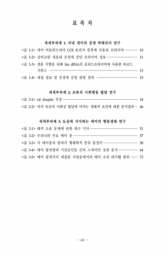 표 목 차 세세부과제 1국내 개미의 공생 박테리아 연구 표 1-1 개미 미토콘드리아 COI 유전자 증폭에 사용된 프라이머 ·············· 10 표 1-2 성비교란 세포내 공생체 진단 프라이머 정보 ···································· 11 표 1-3 샘플 식별을 위해 16s rRNA의 포워드프라이머에 사용한 바코드 시퀀스 ········································································································ 13 표 1-4 채집 정보 및 공생체 감염 판별 결과 ················································ 15 세세부과제 2조류의...