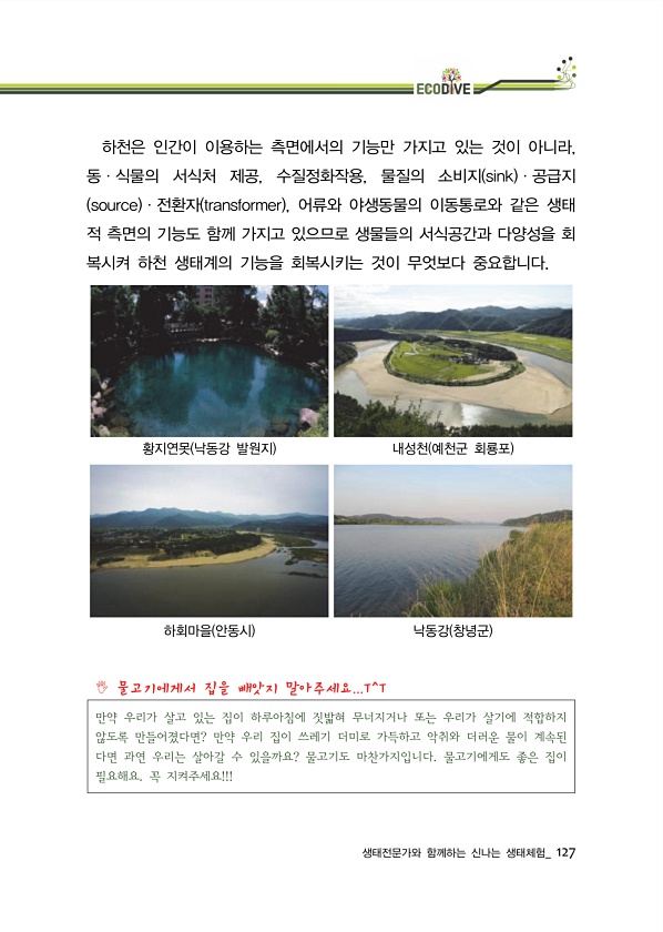 생태전문가와 함께하는 신나는 생태체험_ 127 하천은 인간이 이용하는 측면에서의 기능만 가지고 있는 것이 아니라, 동·식물의 서식처 제공, 수질정화작용, 물질의 소비지 sink ·공급지 source ·전환자 transformer , 어류와 야생동물의 이동통로와 같은 생태 적 측면의 기능도 함께 가지고 있으므로 생물들의 서식공간과 다양성을 회 복시켜 하천 생태계의 기능을 회복시키는 것이 무엇보다 중요합니다. 황지연못 낙동강 발원지 내성천 예천군 회룡포 하회마을 안동시 낙동강 창녕군 ? 물고기에게서 집을 빼앗지 말아주세요...T^T 만약 우리가 살고 있는 집이 하루아침에 짓밟혀 무너지거나 또는 우리가 살기에 적합하지 않도록 만들어졌다면? 만약 우리 집이 쓰레기 더미로 가득하고 악취와 더러운 물이 계속된 다면 과...