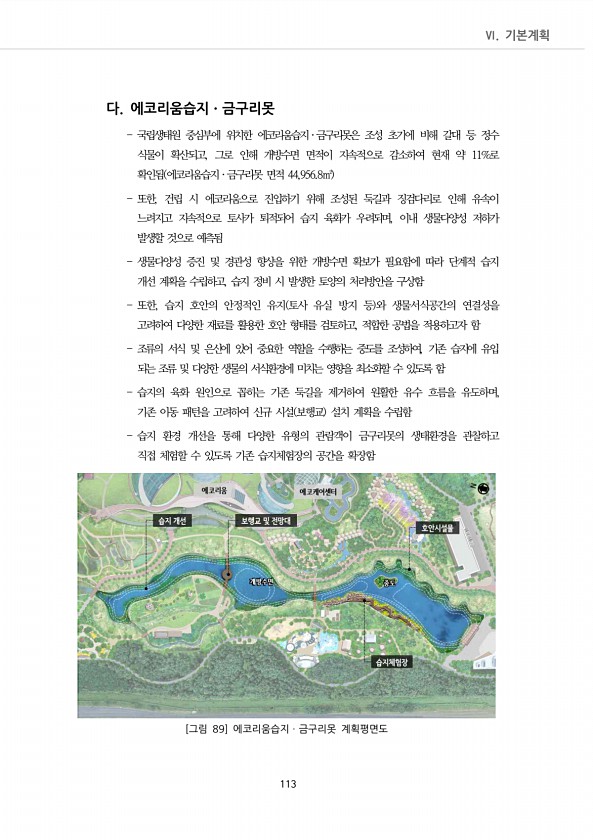 Ⅵ. 기본계획 113 다. 에코리움습지ㆍ금구리못 국립생태원 중심부에 위치한 에코리움습지ㆍ금구리못은 조성 초기에 비해 갈대 등 정수 식물이 확산되고, 그로 인해 개방수면 면적이 지속적으로 감소하여 현재 약 11%로 확인됨 에코리움습지ㆍ금구리못 면적 44,956.8㎡ 또한, 건립 시 에코리움으로 진입하기 위해 조성된 둑길과 징검다리로 인해 유속이 느려지고 지속적으로 토사가 퇴적되어 습지 육화가 우려되며, 이내 생물다양성 저하가 발생할 것으로 예측됨 생물다양성 증진 및 경관성 향상을 위한 개방수면 확보가 필요함에 따라 단계적 습지 개선 계획을 수립하고, 습지 정비 시 발생한 토양의 처리방안을 구상함 또한, 습지 호안의 안정적인 유지 토사 유실 방지 등 와 생물서식공간의 연결성을 고려하여 다양한 재료를 활용한 호안...