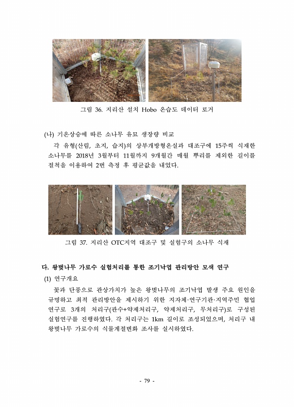79 그림 36. 지리산 설치 Hobo 온습도 데이터 로거 나 기온상승에 따른 소나무 유묘 생장량 비교 각 유형 산림, 초지, 습지 의 상부개방형온실과 대조구에 15주씩 식재한 소나무를 2018년 3월부터 11월까지 9개월간 매월 뿌리를 제외한 길이를 절척을 이용하여 2번 측정 후 평균값을 내었다. 그림 37. 지리산 OTC지역 대조구 및 실험구의 소나무 식재 다. 왕벚나무 가로수 실험처리를 통한 조기낙엽 관리방안 모색 연구 1 연구개요 꽃과 단풍으로 관상가치가 높은 왕벚나무의 조기낙엽 발생 주요 원인을 규명하고 최적 관리방안을 제시하기 위한 지자체·연구기관·지역주민 협업 연구로 3개의 처리구 관수+약제처리구, 약제처리구, 무처리구 로 구성된 실험연구를 진행하였다. 각 처리구는 1km 길이로 조성되었으며, ...