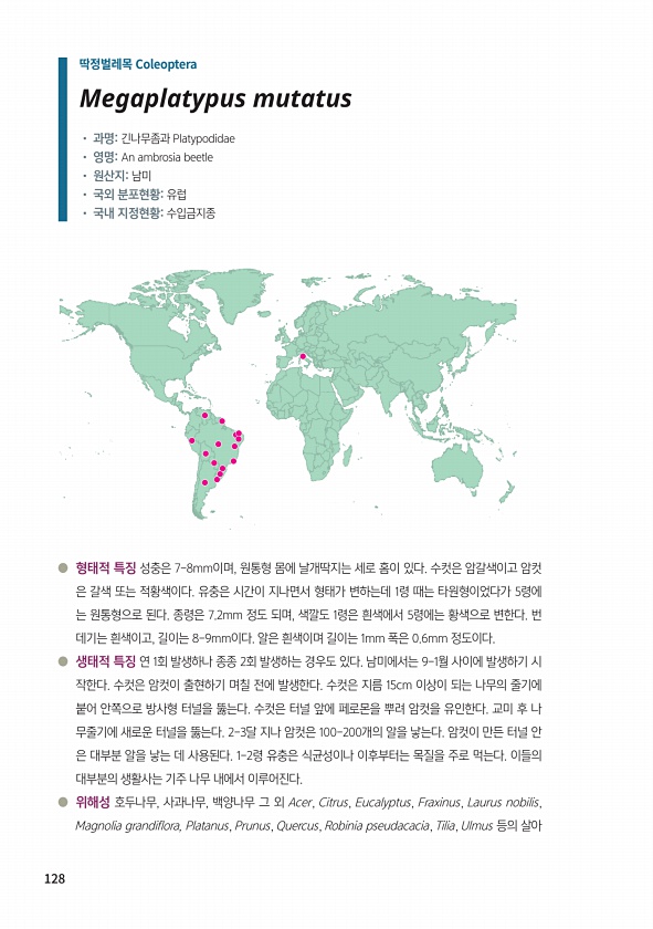 128 ● 형태적 특징 성충은 7-8mm이며, 원통형 몸에 날개딱지는 세로 홈이 있다. 수컷은 암갈색이고 암컷 은 갈색 또는 적황색이다. 유충은 시간이 지나면서 형태가 변하는데 1령 때는 타원형이었다가 5령에 는 원통형으로 된다. 종령은 7.2mm 정도 되며, 색깔도 1령은 흰색에서 5령에는 황색으로 변한다. 번 데기는 흰색이고, 길이는 8-9mm이다. 알은 흰색이며 길이는 1mm 폭은 0.6mm 정도이다. ● 생태적 특징 연 1회 발생하나 종종 2회 발생하는 경우도 있다. 남미에서는 9-1월 사이에 발생하기 시 작한다. 수컷은 암컷이 출현하기 며칠 전에 발생한다. 수컷은 지름 15cm 이상이 되는 나무의 줄기에 붙어 안쪽으로 방사형 터널을 뚫는다. 수컷은 터널 앞에 페로몬을 뿌려 암컷을 유인한다. 교미 후...