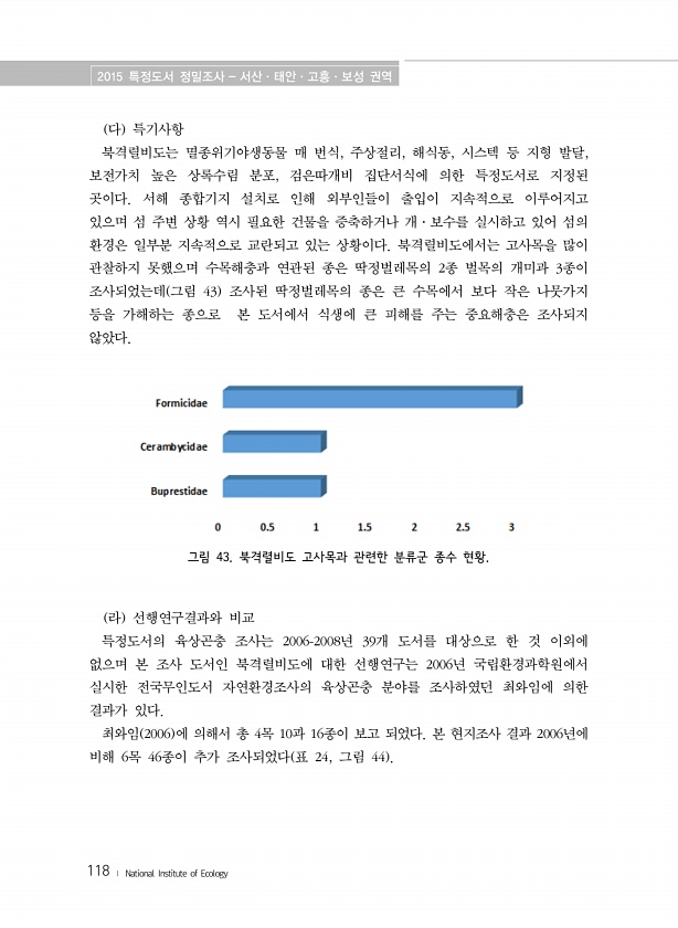 2015 특정도서 정밀조사 서산·태안·고흥·보성 권역 118 ? National Institute of Ecology 다 특기사항 북격렬비도는 멸종위기야생동물 매 번식, 주상절리, 해식동, 시스텍 등 지형 발달, 보전가치 높은 상록수림 분포, 검은따개비 집단서식에 의한 특정도서로 지정된 곳이다. 서해 종합기지 설치로 인해 외부인들이 출입이 지속적으로 이루어지고 있으며 섬 주변 상황 역시 필요한 건물을 증축하거나 개·보수를 실시하고 있어 섬의 환경은 일부분 지속적으로 교란되고 있는 상황이다. 북격렬비도에서는 고사목을 많이 관찰하지 못했으며 수목해충과 연관된 종은 딱정벌레목의 2종 벌목의 개미과 3종이 조사되었는데 그림 43 조사된 딱정벌레목의 종은 큰 수목에서 보다 작은 나뭇가지 등을 가해하는 종으로 본 도서...