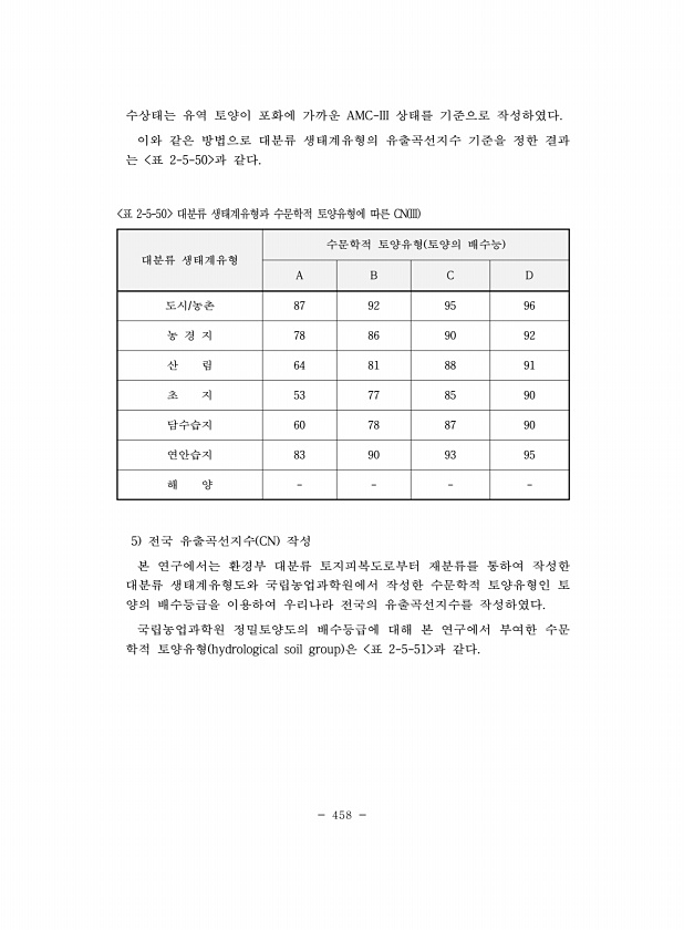 458 수상태는 유역 토양이 포화에 가까운 AMC-III 상태를 기준으로 작성하였다. 이와 같은 방법으로 대분류 생태계유형의 유출곡선지수 기준을 정한 결과 는 표 2-5-50 과 같다. 대분류 생태계유형 수문학적 토양유형 토양의 배수능 A B C D 도시/농촌 87 92 95 96 농 경 지 78 86 90 92 산 림 64 81 88 91 초 지 53 77 85 90 담수습지 60 78 87 90 연안습지 83 90 93 95 해 양 표 2-5-50 대분류 생태계유형과 수문학적 토양유형에 따른 CN III 5 전국 유출곡선지수 CN 작성 본 연구에서는 환경부 대분류 토지피복도로부터 재분류를 통하여 작성한 대분류 생태계유형도와 국립농업과학원에서 작성한 수문학적 토양유형인 토 양의 배수등급을 이용하여 우리나라...