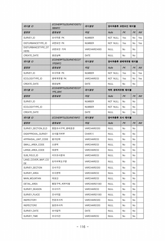 116 테이블 ID ECOHERPTILESURVEYDISTU RBINFO 테이블명 양서파충류 교란요인 테이블 컬럼명 컬럼설명 타입 Nulls PK FK INX SURVEY_ID 조사자료 PK NUMBER NOT NULL Yes No Yes DISTURBANCETYPE_ID 교란요인 PK NUMBER NOT NULL Yes No Yes DISTURBANCETYPE_OT HERS 교란요인 기타 VARCHAR2 400 NULL No No CREATE_DATE 생성날짜 DATE NULL No No 테이블 ID ECOHERPTILESURVEYECOT YPEINFO 테이블명 양서파충류 생태계유형 테이블 컬럼명 컬럼설명 타입 Nulls PK FK INX SURVEY_ID 조사자료 PK NUMBER NOT NULL Yes...