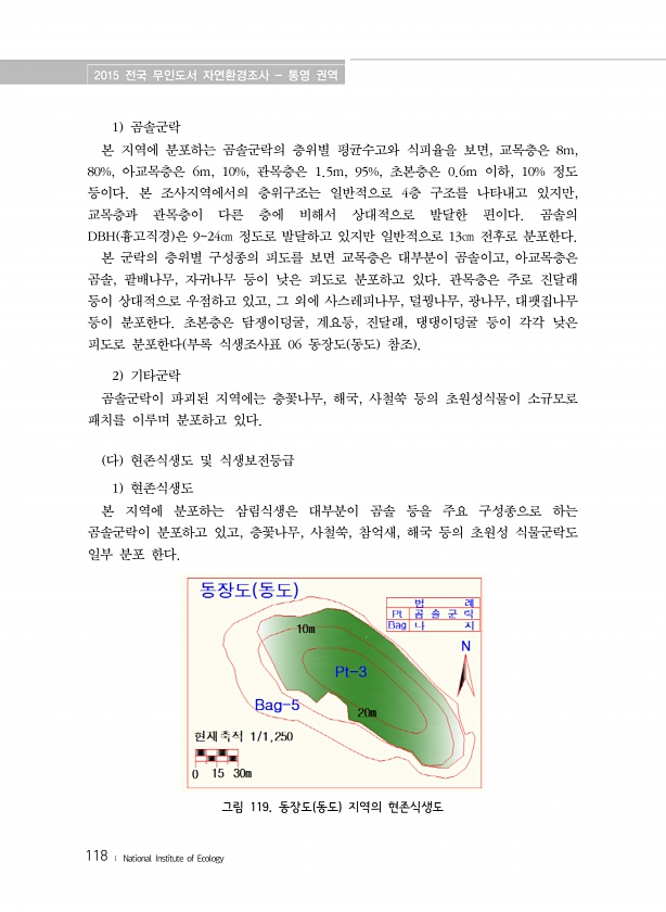 2015 전국 무인도서 자연환경조사 통영 권역 118 ? National Institute of Ecology 1 곰솔군락 본 지역에 분포하는 곰솔군락의 층위별 평균수고와 식피율을 보면, 교목층은 8m, 80%, 아교목층은 6m, 10%, 관목층은 1.5m, 95%, 초본층은 0.6m 이하, 10% 정도 등이다. 본 조사지역에서의 층위구조는 일반적으로 4층 구조를 나타내고 있지만, 교목층과 관목층이 다른 층에 비해서 상대적으로 발달한 편이다. 곰솔의 DBH 흉고직경 은 924㎝ 정도로 발달하고 있지만 일반적으로 13㎝ 전후로 분포한다. 본 군락의 층위별 구성종의 피도를 보면 교목층은 대부분이 곰솔이고, 아교목층은 곰솔, 팥배나무, 자귀나무 등이 낮은 피도로 분포하고 있다. 관목층은 주로 진달래 등이 상대적으...