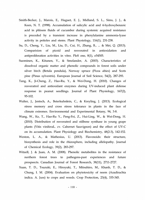 110 Smith-Becker, J., Marois, E., Huguet, E. J., Midland, S. L., Sims, J. J., & Keen, N. T. 1998 Accumulation of salicylic acid and 4-hydroxybenzoic acid in phloem fluids of cucumber during systemic acquired resistance is preceded by a transient increase in phenylalanine ammonia-lyase activity in petioles and stems. Plant Physiology, 116 1 , 231-238. Su, D., Cheng, Y., Liu, M., Liu, D., Cui, H., Z...