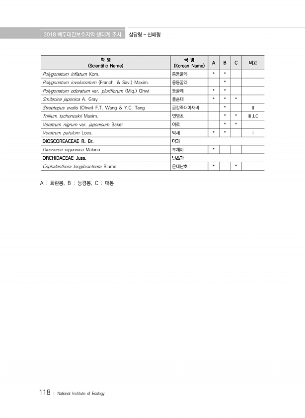 2018 백두대간보호지역 생태계 조사 삽당령 신배령 118 ? National Institute of Ecology 학 명 Scientific Name 국 명 Korean Name A B C 비고 Polygonatum inflatum Kom. 퉁둥굴레 * * Polygonatum involucratum Franch. & Sav. Maxim. 용둥굴레 * Polygonatum odoratum var. pluriflorum Miq. Ohwi 둥굴레 * * Smilacina japonica A. Gray 풀솜대 * * * Streptopus ovalis Ohwi F.T. Wang & Y.C. Tang 금강죽대아재비 * Ⅱ Trillium tschonoskii Maxim. 연영초 * * Ⅲ,LC Veratrum n...