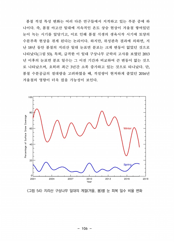 106 봄철 적설 특성 변화는 여러 다른 연구들에서 지적하고 있는 부분 중에 하 나이다. 즉, 봄철 아고산 일대에 지속적인 온도 상승 현상이 겨울철 쌓여있던 눈이 녹는 시기를 앞당기고, 이로 인해 봄철 식생의 생육시작 시기에 토양의 수분부족 현상을 겪게 된다는 논리이다. 하지만, 위성관측 결과에 의하면, 지 난 18년 동안 봄철의 지리산 일대 눈표면 분포는 크게 변동이 없었던 것으로 나타났다 그림 53 특히, 급격한 이 일대 구상나무 군락의 고사를 보였던 2013 년 이후의 눈표면 분포 일수는 그 이전 기간과 비교하여 큰 변동이 없는 것으 로 나타났으며, 오히려 최근 3년간 소폭 증가하고 있는 것으로 타나났다. 단, 봄철 수분공급의 절대량을 고려하였을 때, 적설량이 현저하게 줄었던 2016년 겨울철의 영향이...