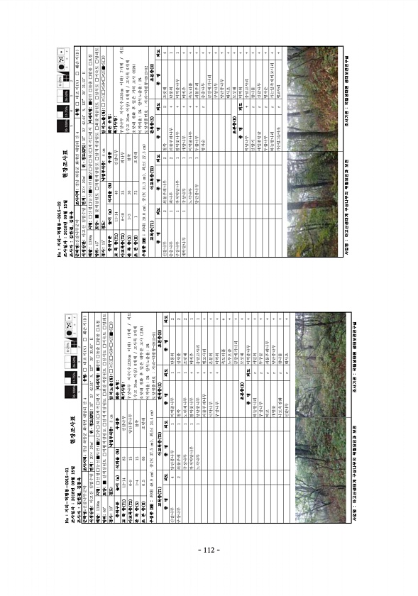 No 지리-덕평봉-0915-01 조사일자 2018년 09월 15일 조사자 김한결, 김?? 현장조사표 군락명신갈나무군락 조사지역경남 하동군 화개면 대성리 산 4 유형□ 대조지 N □ 훼손지 D 식생상관아고산 침엽수림 면적20× 20㎡ 위·경도 GPS 35° 19′ 42.51″ N, 127° 39′ 30.65″ E 해발1398m 지형□산정□능선■사면 ■상□중□하 □계곡□평지 미세지형■평면 □돌출 □함몰 □요철 방위60° 토양■ 갈색삼림토 □적황색삼림토 □암적색삼림토 □회갈색삼림토 □침식토 □미숙토 □암쇄토 경사10° 경도낙엽부식층3 cm 암석노출 % □≥51□ 50 □ 25■ 5□0 층위구분 높이 m 식피율 % 우점종 훼손 유형교 목 층 T1 12-14 85 신갈나무 특기사항구상나무 치수 수고30cm 이하 1개...