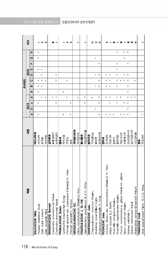 118 ? National Institute of Ecology 학명 국명 조사년도 2013 2018 비고 a b c d A B C D E F G H SALICACEAE Mirb. 버드나무과 Populus davidiana Dode 사시나무 * * * * * * * * Ⅰ Salix rorida Lacksch. 분버들 * * * * * Ⅱ Salix xerophila Flod. 여우버들 * * Ⅱ BRASSICACEAE Burnett 십자화과 Cardamine amaraeformis Nakai 꽃황새냉이 * Ⅲ Cardamine komarovii Nakai 는쟁이냉이 * * * * Ⅰ PRIMULACEAE Borkh. 앵초과 Lysimachia barystachys Bunge 까치수염 * * Ⅰ Primul...