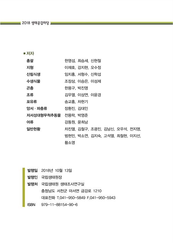 ■저자 총괄 한영섭, 최승세, 신현철 지형 이재호, 강지현, 오수정 산림식생 임치홍, 서형수, 신학섭 수생식물 조장삼, 이승은, 이성제 곤충 한용구, 박진영 조류 김우열, 이상연, 이윤경 포유류 송교홍, 차현기 양서·파충류 장환진, 김대인 저서성대형무척추동물 전용락, 박영준 어류 강동원, 윤희남 일반현황 차진열, 김철구, 조광진, 김남신, 오우석, 전지영, 범현민, 박소연, 김지숙, 고석열, 최철현, 이지선, 황소영 발행일 2018년 10월 13일 발행인 국립생태원장 발행처 국립생태원 생태조사연구실 충청남도 서천군 마서면 금강로 1210 대표전화 T.041-950-5849 F.041-950-5943 ISBN979-11-88154-90-6