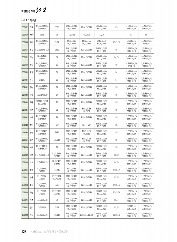 366152 판교 E1,E2,E3,E4,E5, E6,E7,E8,E9 E2,E5 E1,E2,E3,E4,E5, E6,E7,E8,E9 E2,E4,E5,E6,E8 E1,E2,E3,E4,E5, E6,E7,E8,E9 E5 E1,E2,E3,E4,E5, E6,E7,E8,E9 E1,E2,E3,E4,E5, E6,E7,E8,E9 366153 개야 E3,E6 E8 E3,E5,E8 E5,E8,E9 E3,E8 E3 E8 366154 서천 E1,E2,E3,E4,E5, E6,E7,E8,E9 E1,E2 E1,E3,E4,E5, E6,E7,E8,E9 E1,E2,E4,E5, E6,E7,E8,E9 E1,E2,E3,E4, E5,E6,E8,E9 E1,E2,E5 E1,E2,E3,E4, E5,E6,E8,E9 E1,E2,E3,E4,E5, E6,E8,E9...