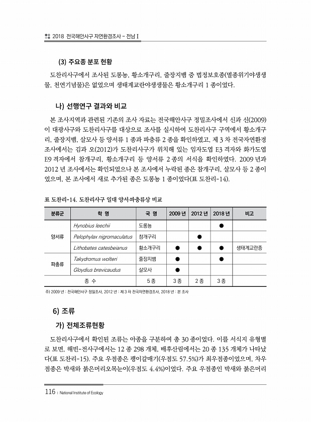 2018 전국해안사구 자연환경조사 전남Ⅰ 116 ? National Institute of Ecology 3 도찬리사구에서 조사된 도롱뇽, 황소개구리, 줄장지뱀 중 법정보호종 멸종위기야생생 물, 천연기념물 은 없었으며 생태계교란야생생물은 황소개구리 1 종이었다. 본 조사지역과 관련된 기존의 조사 자료는 전국해안사구 정밀조사에서 신과 신 2009 이 대광사구와 도찬리사구를 대상으로 조사를 실시하여 도찬리사구 구역에서 황소개구 리, 줄장지뱀, 살모사 등 양서류 1 종과 파충류 2 종을 확인하였고, 제 3 차 전국자연환경 조사에서는 김과 오 2012 가 도찬리사구가 위치해 있는 임자도엽 E3 격자와 화가도엽 E9 격자에서 참개구리, 황소개구리 등 양서류 2 종의 서식을 확인하였다. 2009 년과 2012 년 조사...