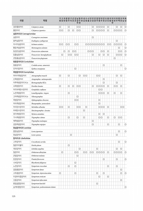 126 검은물잠자리 Calopteryx atrata ○ ○ ○○ ○ ○○○○ ○ ○ ○ ○ 물잠자리 Calopteryx japonica ○○ ○ ○ ○○ ○ ○○○○ ○ ○○○○ ○ 실잠자리과 Coenagrionidae 실잠자리 Coenagrion concinnum ○ 알락실잠자리 Enallagma cyathigerum ○ 아시아실잠자리 Ischnura asiatica ○○ ○○ ○○ ○○○○○○○○○ ○○ ○○○○ ○ 황등색실잠자리 Mortonagrion selenion ○ ○ 등검은실잠자리 Paracercion calamorum ○ ○ ○○ ○○○ ○○ ○ ○○ ○ 등줄실잠자리 Paracercion hieroglyphicum ○ ○○ ○○ ○ ○ ○ ○ ○○○ ○ 큰등줄실잠자리 Paracercion pl...