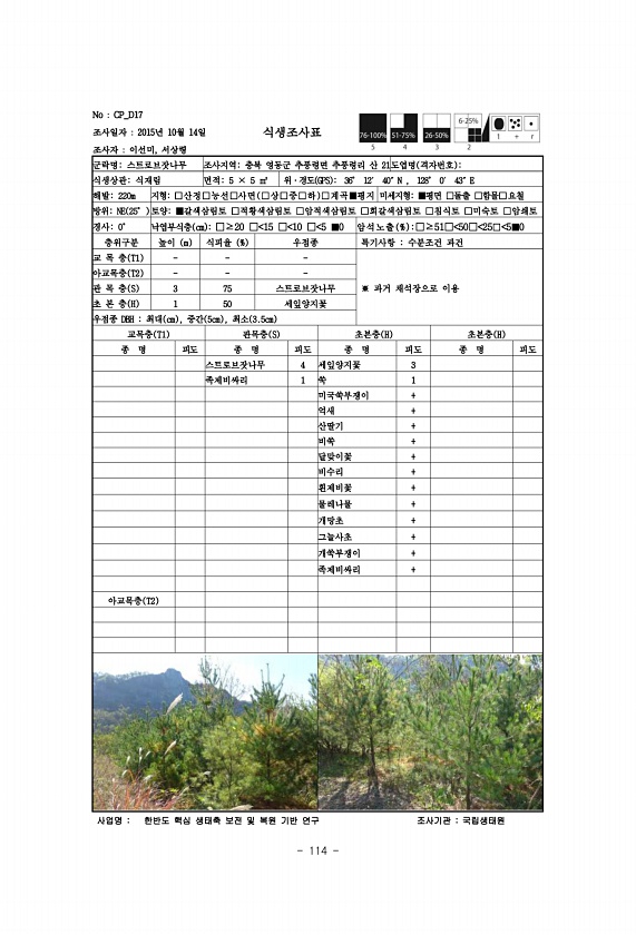 114 No CP_D17 조사일자 2015년 10월 14일 조사자 이선미, 서상령 식생조사표 군락명스트로브잣나무 조사지역충북 영동군 추풍령면 추풍령리 산 21도엽명 격자번호 식생상관식재림 면적5 × 5 ㎡ 위·경도 GPS 36° 12′ 40″N , 128° 0′ 43″E 해발220m 지형□산정□능선□사면 □상□중□하 □계곡■평지 미세지형■평면 □돌출 □함몰□요철 방위NE 25° 토양■갈색삼림토 □적황색삼림토 □암적색삼림토 □회갈색삼림토 □침식토 □미숙토 □암쇄토 경사0° 낙엽부식층 cm □≥20 □ 15 □ 10 □ 5 ■0 암석노 출 % □≥51□ 50□ 25□ 5■0 층위구분 높이 m 식피율 % 우점종 특기사항 수분조건 과건 교 목 층 T1 ※ 과거 채석장으로 이용 아교목층 T2 관 목 층 S 3 75 ...